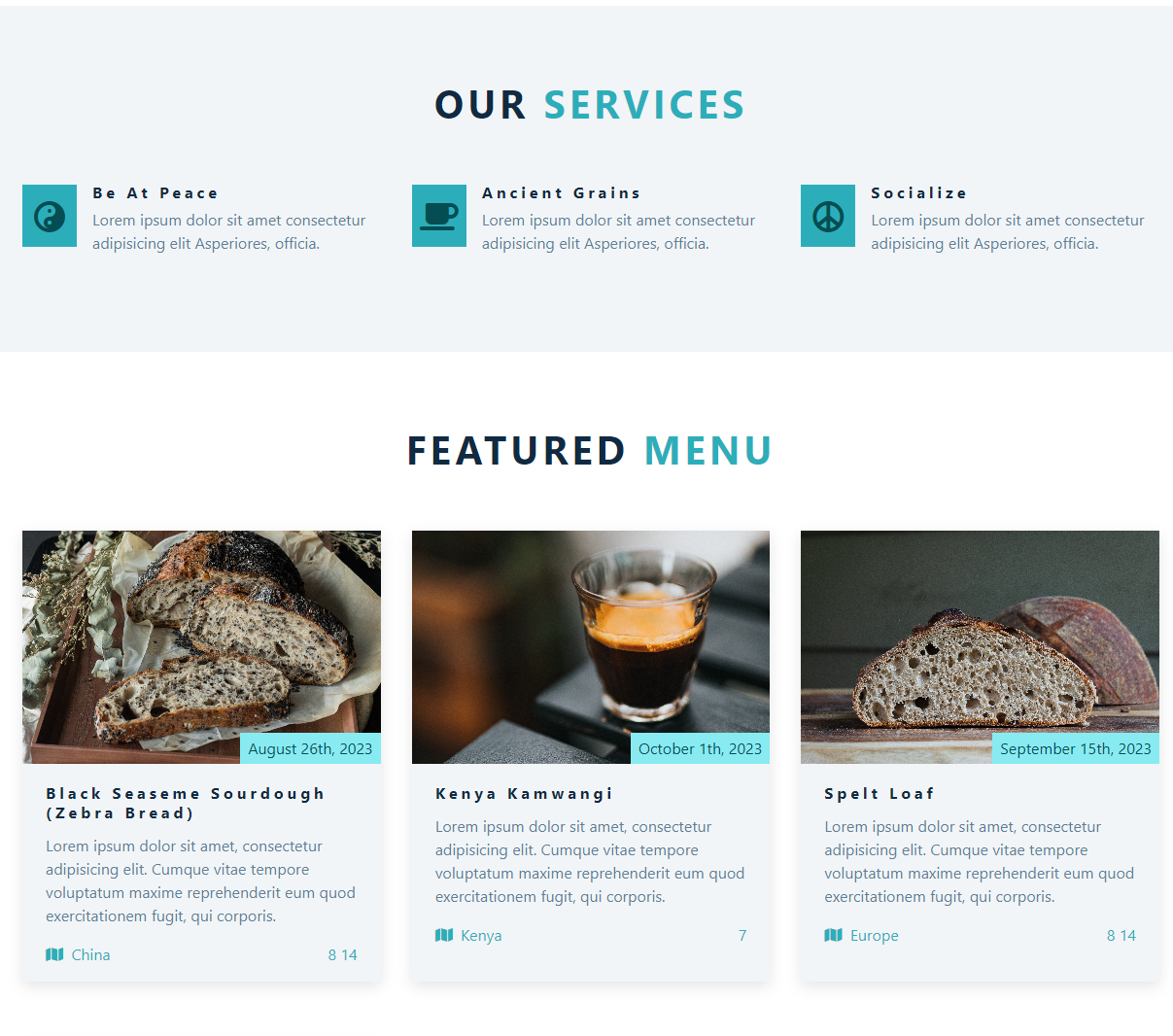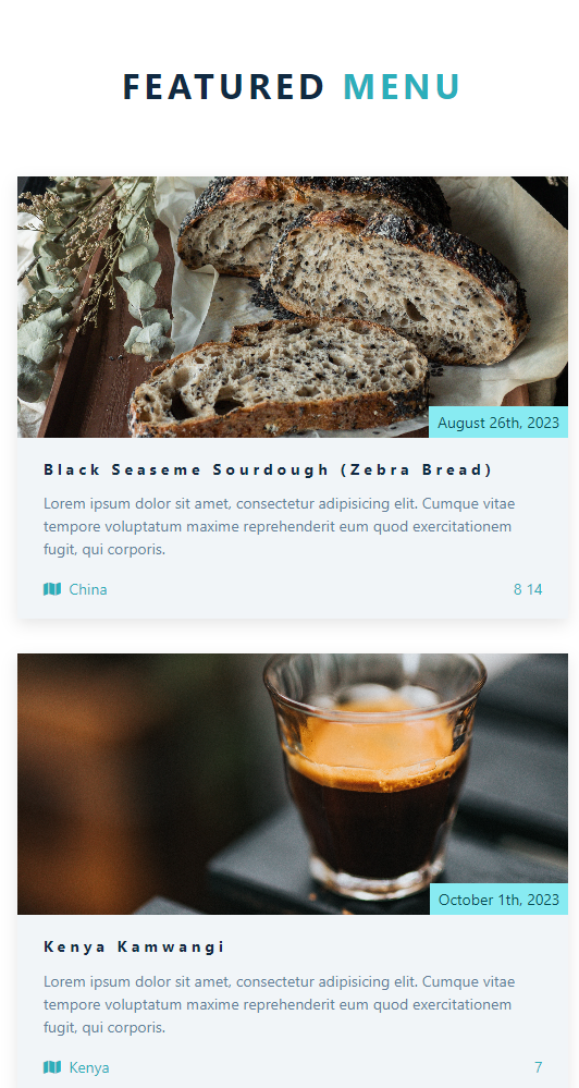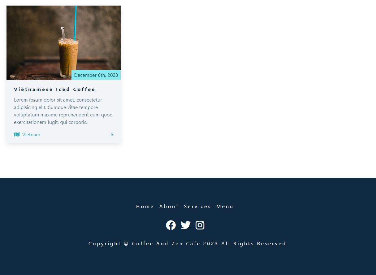 This project represents my first completed React website. It is a single-page website featuring a fictional café that I had previously used in an Angular project. For this project, I aimed to keep the scope simple by including only the necessary items, such as the featured menu, services, and about section. It is fully responsive and mobile friendly using media queries to detect screen size.